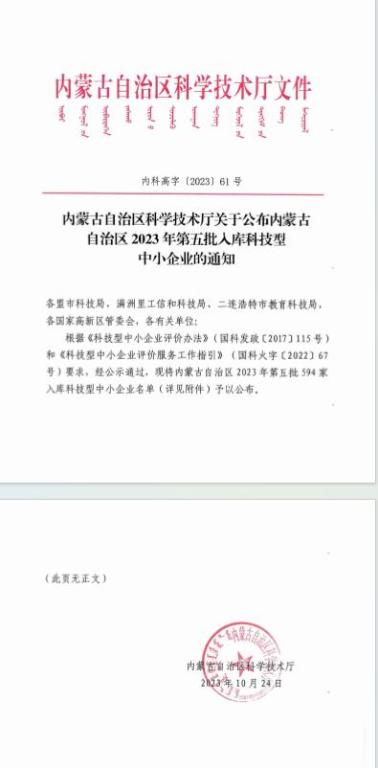 內蒙古自治區2023年第5批入庫科技型中小企業名單公告正文.jpg PICTURE
