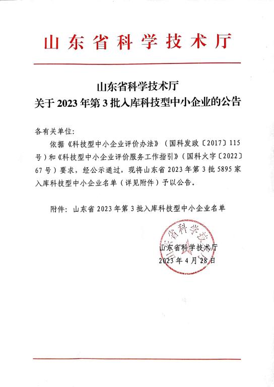 山東省2023年第3批入庫科技型中小企業(yè)名單公告