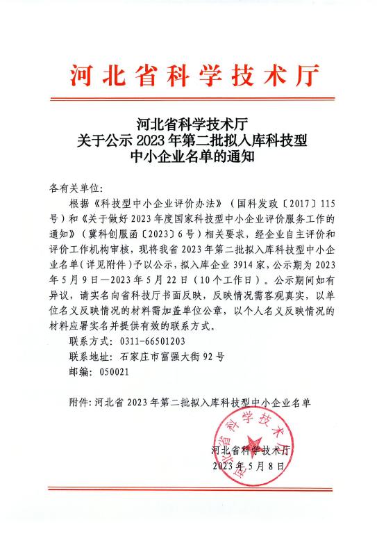 河北省2023年第2批擬入庫科技型中小企業(yè)名單公示