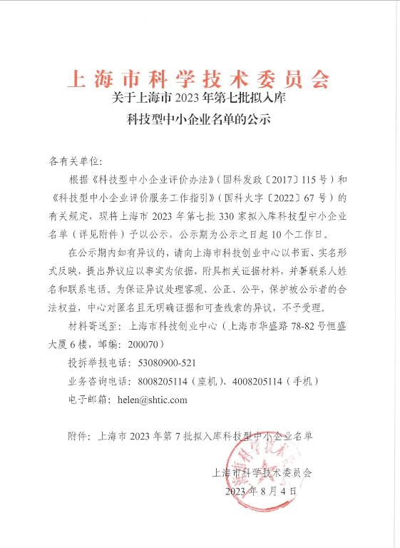 上海市2023年第7批擬入庫科技型中小企業名單公示正文.jpg PICTURE