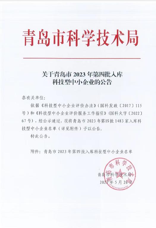 青島市2023年第4批入庫科技型中小企業名單公告正文.jpg PICTURE