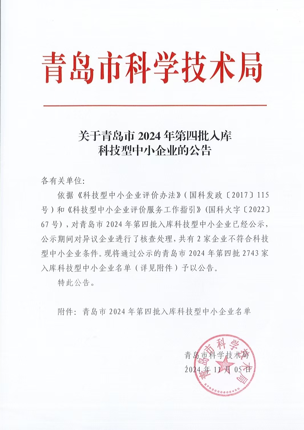青島市2024年第4批入庫(kù)科技型中小企業(yè)名單公告正文.jpg PICTURE